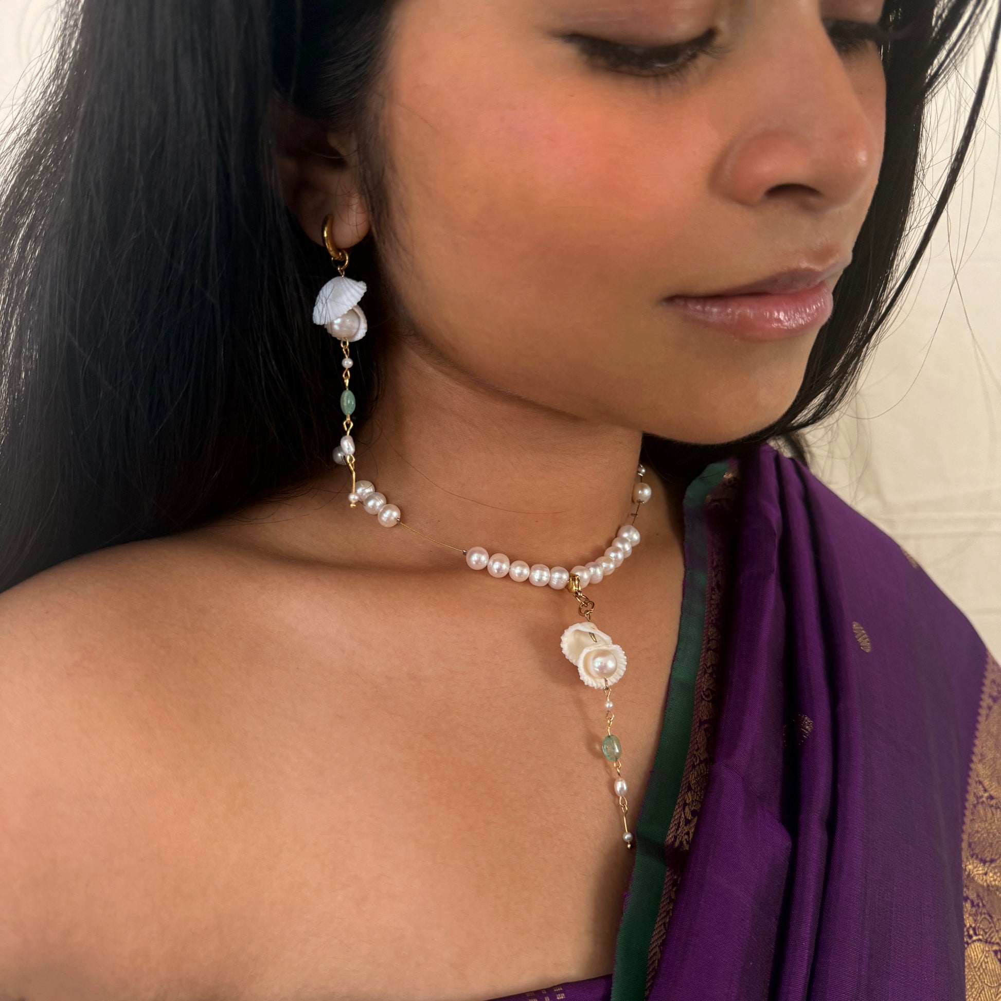material: gold plated stainless steel, fresh water pearl, green quartz beads, sea shells