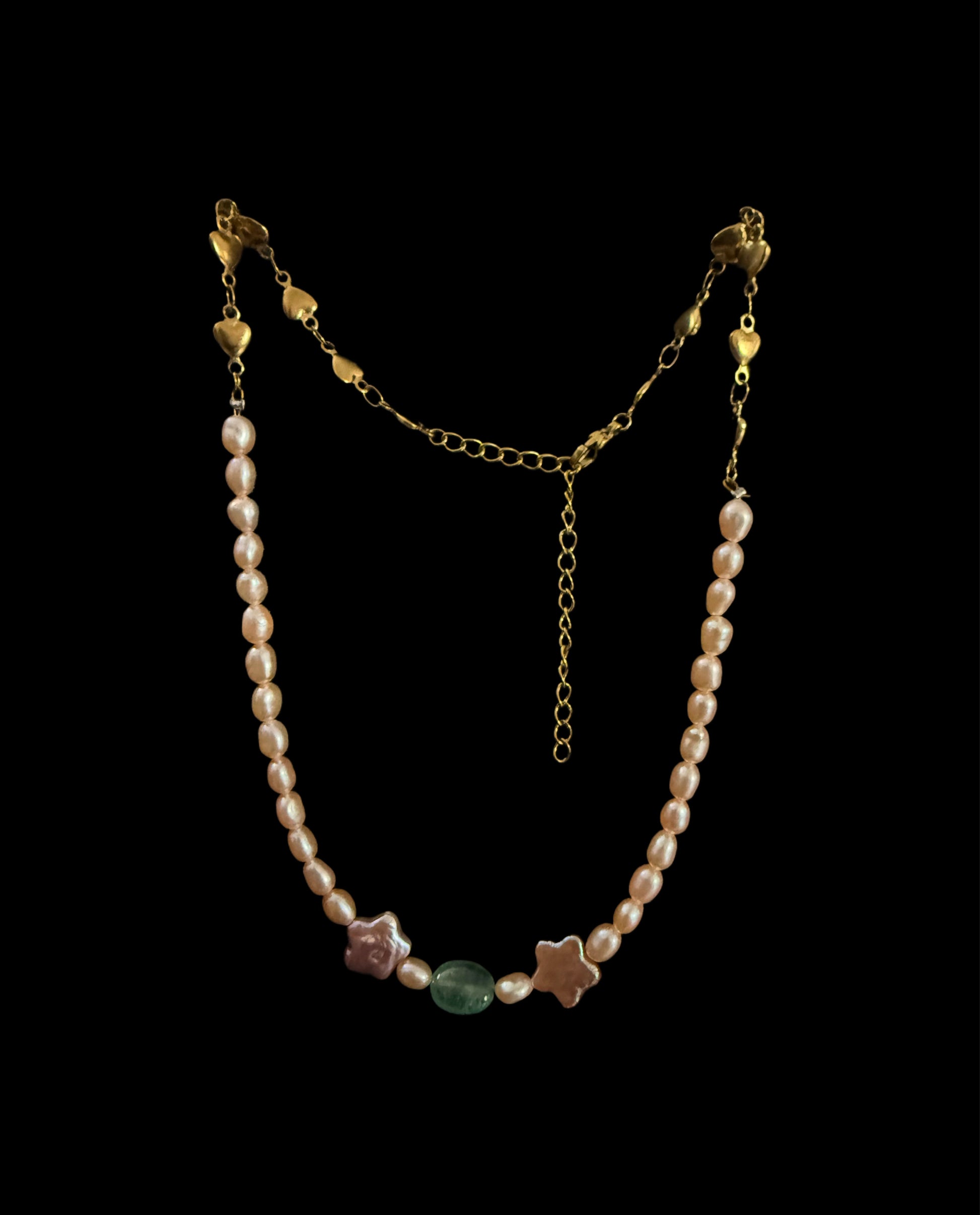 material: gold plated stainless steel, fresh water pearl, green quartz beads