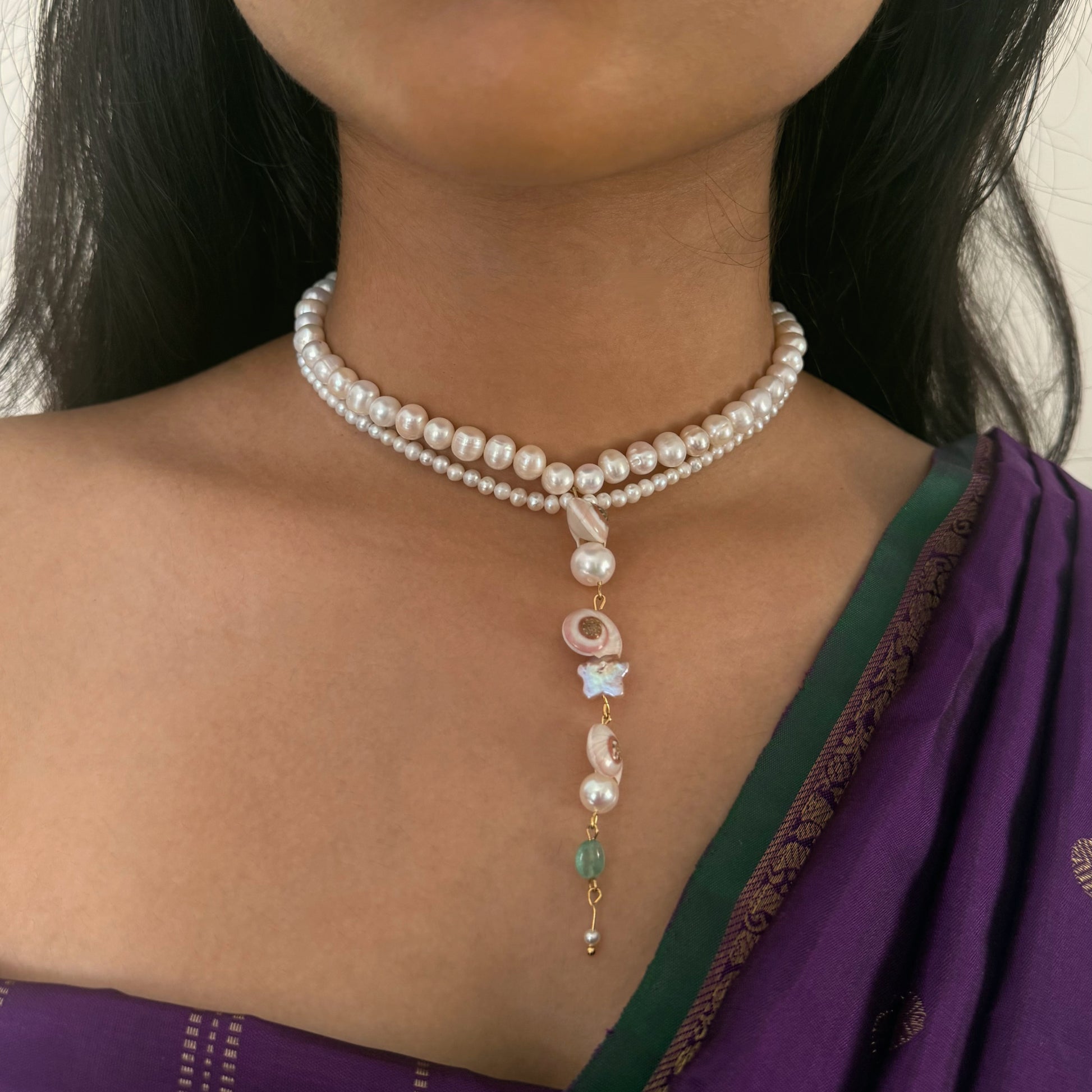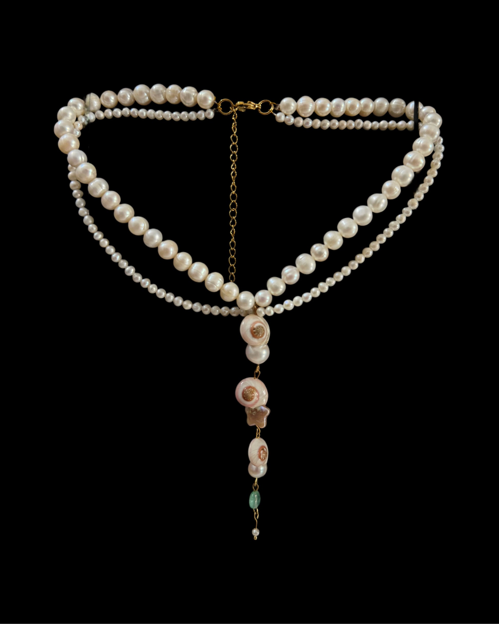 Crafted with layers of pearls and lines of turbo shells, Pink turbo on threads showcases a beautiful story carved into its design. Get lost in its intricate details and add a touch of elegance to any outfit. Elevate your style with this unique piece.